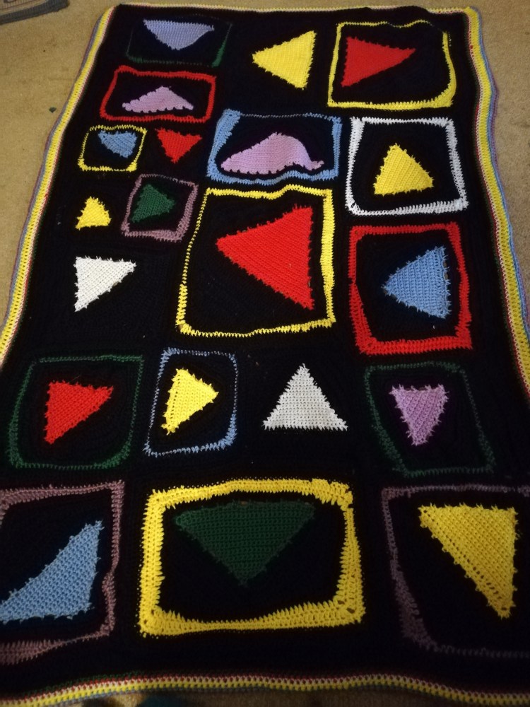 In other news I’ve been enjoying my crochet again and I have several projects in mind – I just finished one the other day which was a blanket for my 5yo son’s BFF. I like the uneven boarders I put around the triangles, I think it gives the blanket a bit of an arty look.