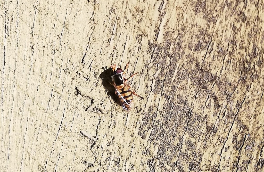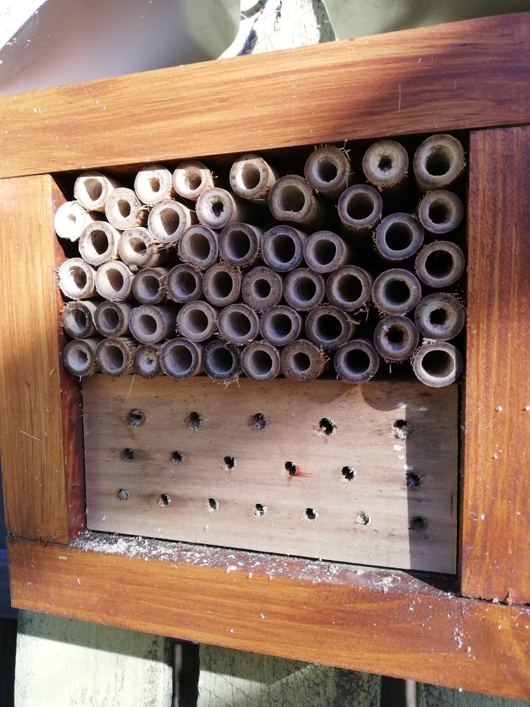 I was checking out my bee hotel earlier for signs of life and several of the holes and tunnels look like they have been used. I was just thinking that I hadn’t seen any actual insects when I saw one little bee buzzing around. 🙂