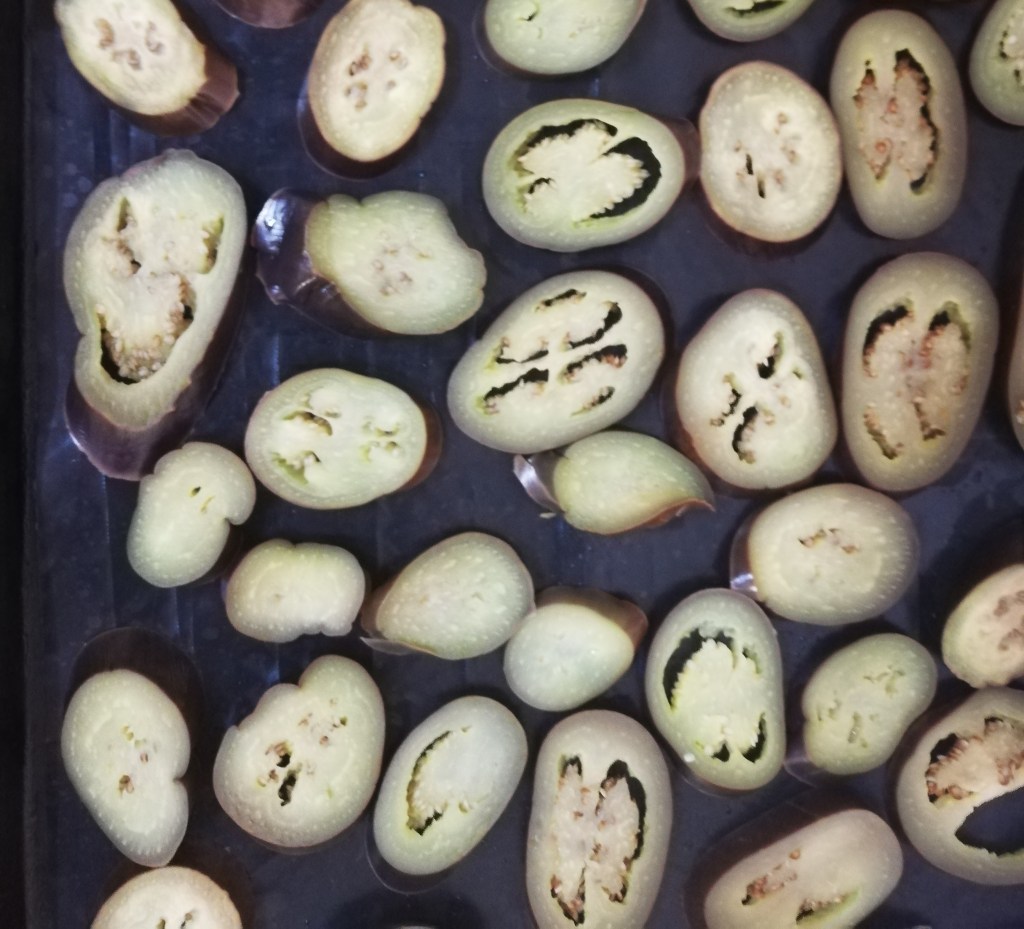 For quite a while I thought the only vegetables that stood up to freezing were peas and corn, but I have found it’s quite a good way to quickly and easily preserve lots of different things. So now I have lots of whole tomatoes, sticks of celery, birds eye chilis, red and green capsicum, edamame, zucchini and eggplant in my freezer. I’ve found if you flash freeze things (spread them on a tray and into the freezer) then you can easily pop them into a resealable container and get just the amount you need. I use a piece of reusable baking paper so there is no sticking to the tray.