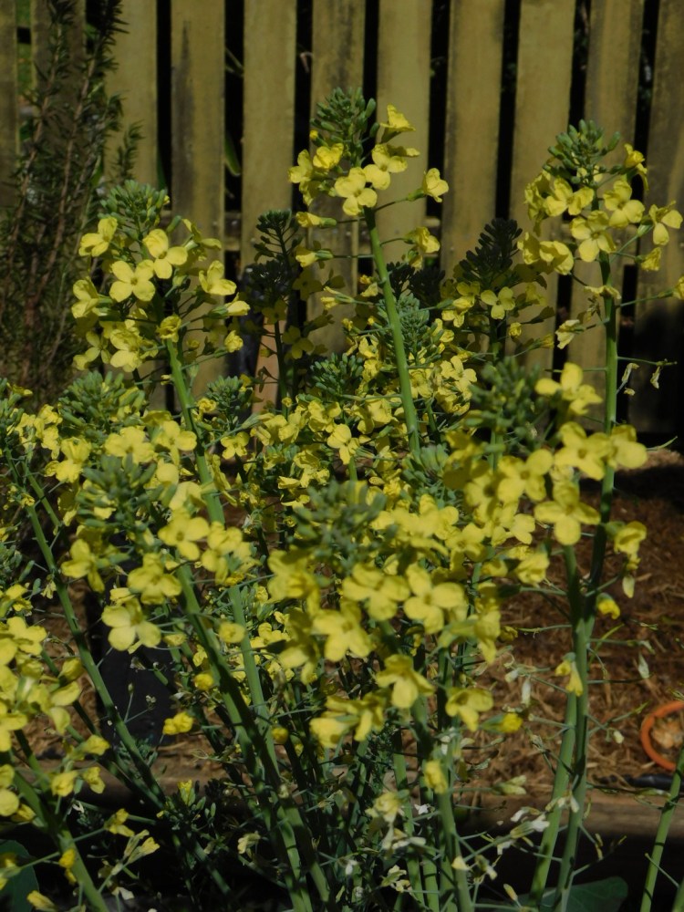 This bed had some beans on a tripod that I have removed – for some reason I never used them there, maybe it was an awkward position for me to access but also I was growing beans that I wasn’t actually that fond of! There is a broad bean plant that I have left as it hasn’t produced any beans as yet. I also left the broccolini that’s gone to flower as the bees seemed to be enjoying it. I have some pak choy and daikon to put in here, and I have some rocket seeds on their way to put in here as well. The bottom half of the bed has our perpetual spinach, rocket, and spring onions.