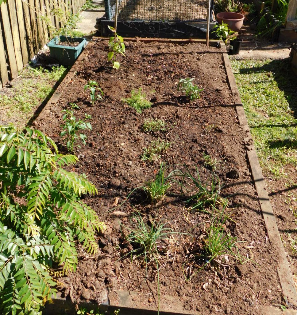 This is our (mainly) herb bed – it was badly overgrown with weeds so Mr T dug out some of the herbs, got rid of the weeds and rejuvenated the soil. It’s now replanted with Thai chili, Jalopeno chili, Cayenne chili, red basil, thyme, oregano, dill, taragon, and chives. I’ve put a trellis at the far end and am going to grow snow peas on it, and the top right corner will probably get some carrots put in there. The bottom left is a curry tree.