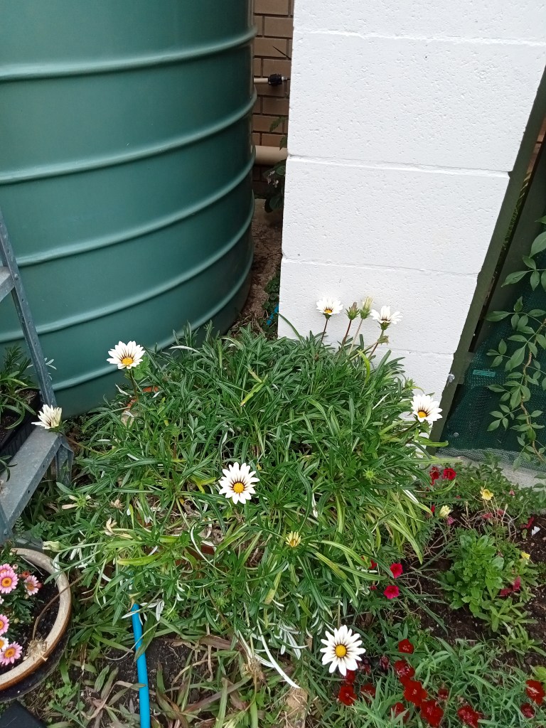 And that big pot of gazanias (below middle) is due to be divided up and the pot moved – it’s right in the way for access to the hose. I’m going to do it bit by bit though because last time I pulled the lot out and it took forever to repot (mainly because I don’t want to “waste” any plants so propagate even the tiniest bits). Plus I have some yellow flower gazania to do first. And I have a birds nest fern that I rescued a while ago (below right) that has come back to life and needs attending to. It looks like it has divided into a two or three ferns which would be rather cool if I can manage to get them all growing.