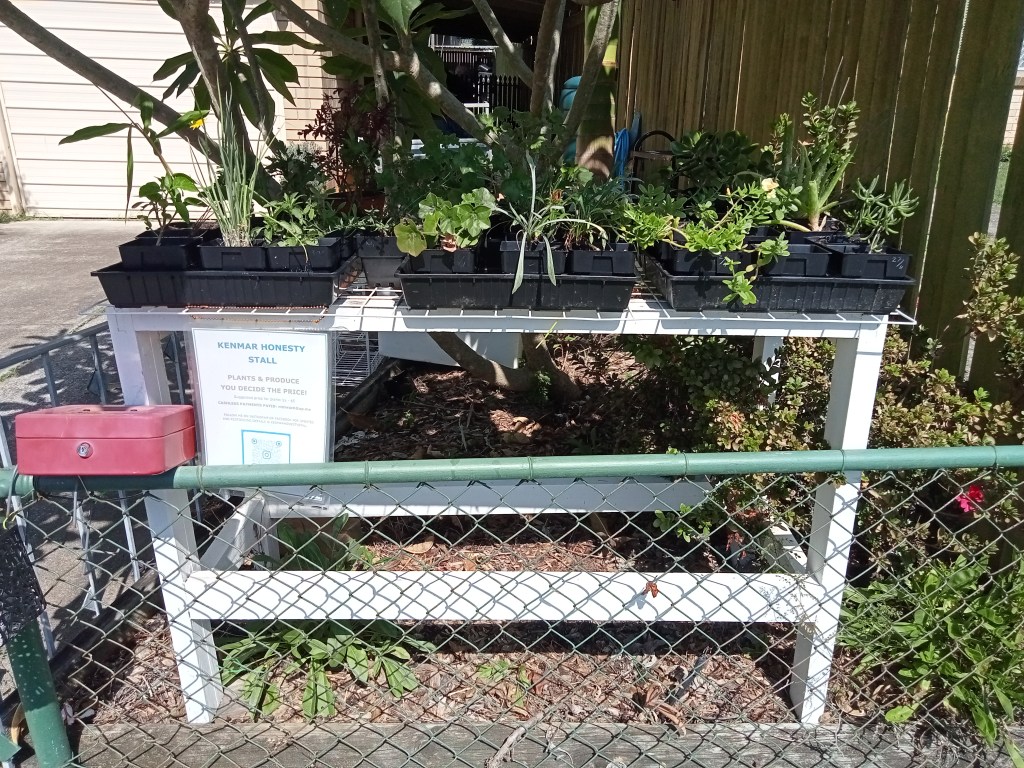 With the help of Mr T I rejigged my stall. It’s got a lovely nice long shelf that sits on the fence and means I can have some work space while I’m tending to the plants. The next thing I want to do is get another sign and put some shade cloth over at least some of it. I also attached some trays to the table which means that the plant pots have a more even surface and aren’t constantly falling over.
