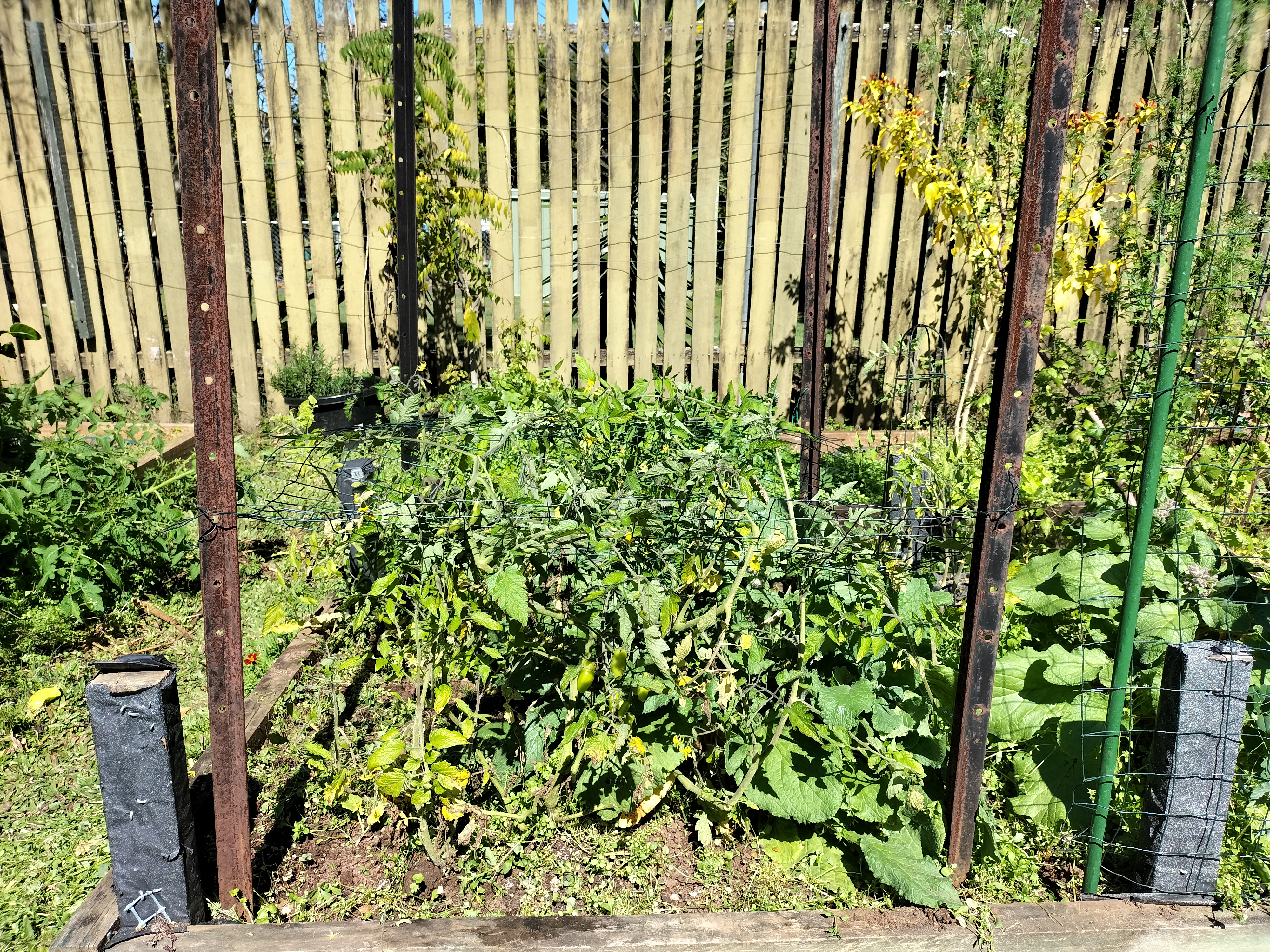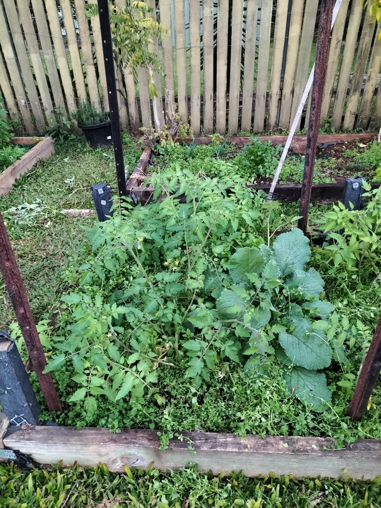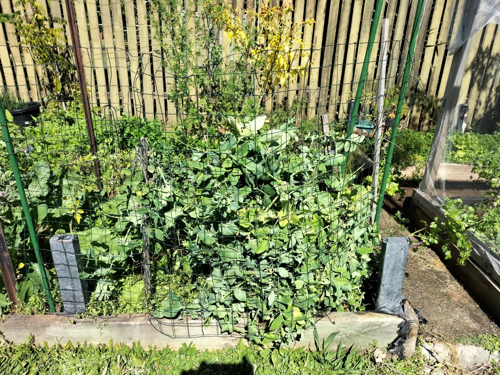 It’s a little hard to see but I did weed around the tomatoes and there is now a horizontal bit of mesh that they can grow through for support. Last year I ended up with two or three layers of the mesh as the tomatoes grew right up to the top of the support! And my snow peas are going to be a bit hard to harvest as they have intertwined so it’s like just one big mass of vegetation. Ah well, I’ve already harvested heaps from them and if we get a few more before the plants give up I will be happy!