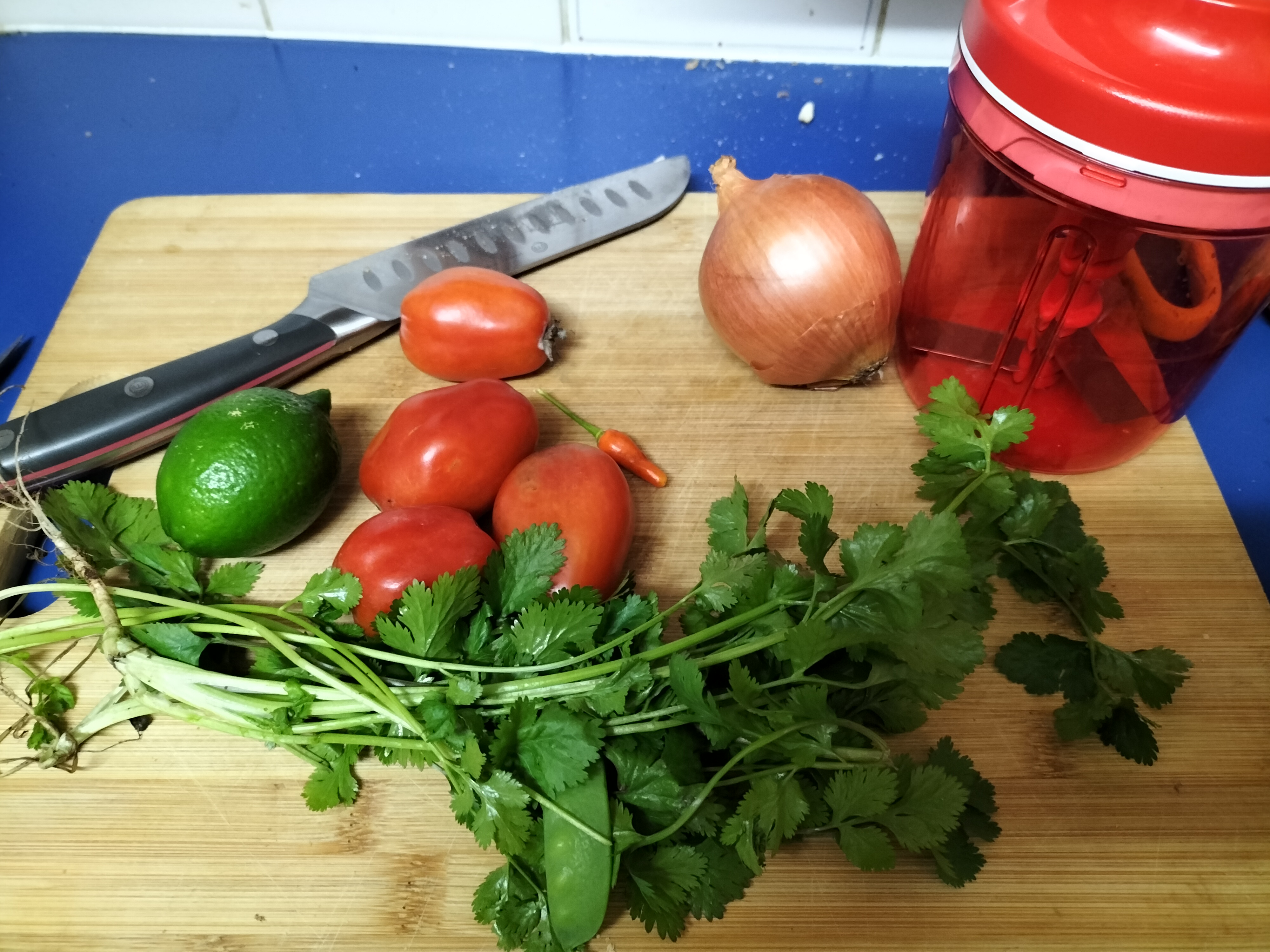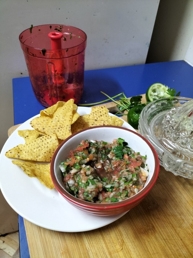 Oh and my neighbour gave me a few ripe roma tomatoes from her garden so I grabbed some coriander, lime and chili from our garden, plus a store bought onion. Threw it all in my handy-dandy Tupperware chopper and made a salsa 🙂 I didn’t quite get the proportions right but it was very tasty all the same and so easy to do. I don’t work for Tupperware but this is by far the best hand food processor I’ve used. And saves getting the big one out if you are only doing a small job.